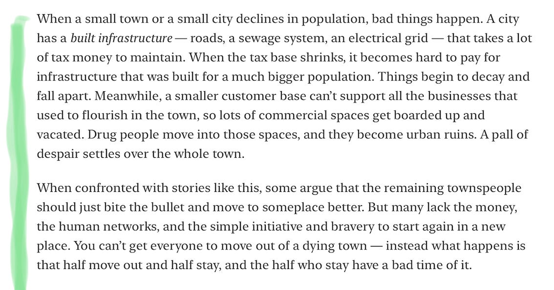 The middle, though, is full of contradictions, especially as more time passes. Canada is an important member of the G7, and is a huge country with relatively few people in it, concentrated in major corridors, of which my home is not one of them. The population is leaving and aging rapidly, and to stave off the coming age-wave (and the unavoidable obligations it brings with it3) the country and it’s provinces continue to implement growth strategies - mostly immigration based.